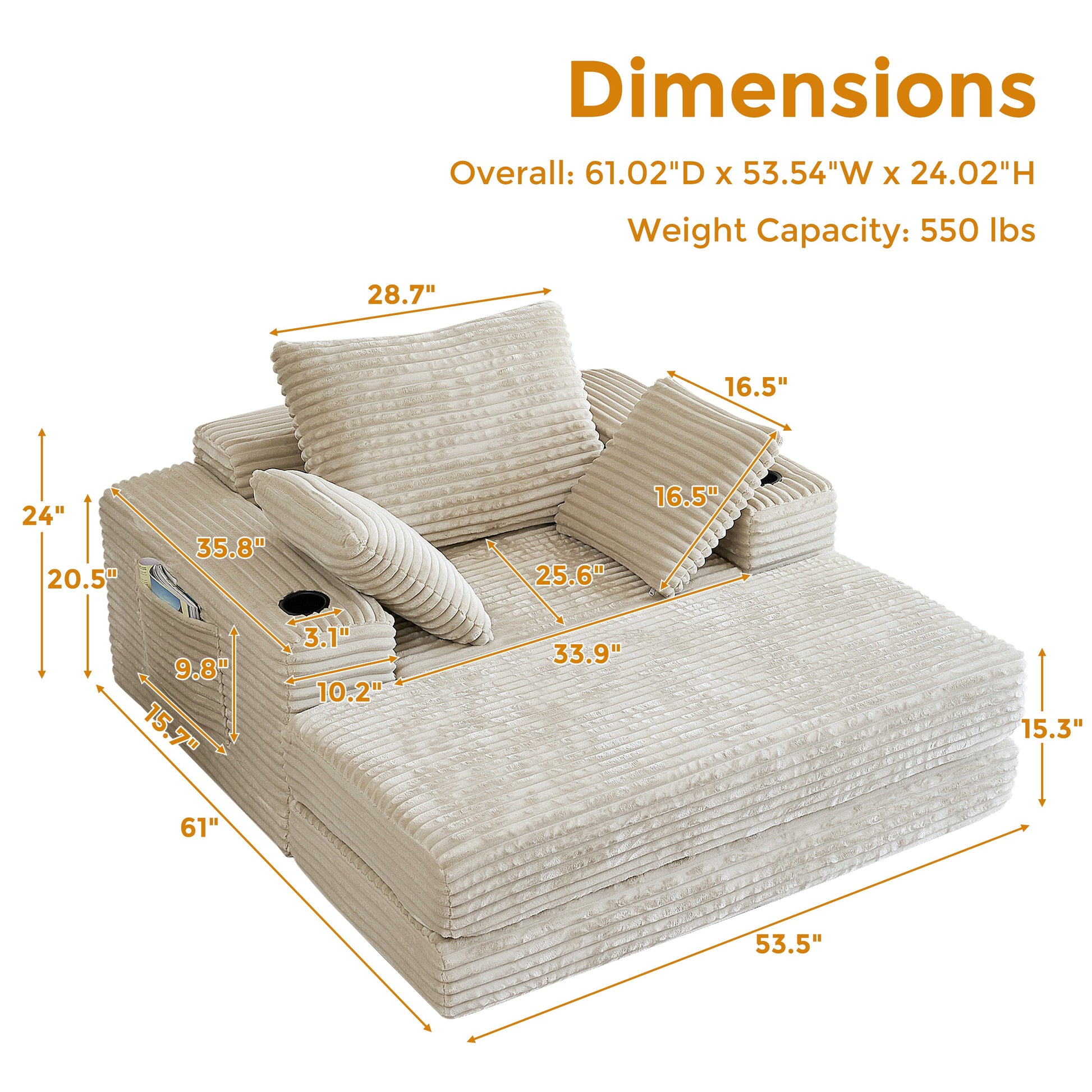 - Overall Dimensions (Including Ottoman): Width 53.5” x Depth 61” x Height 24”